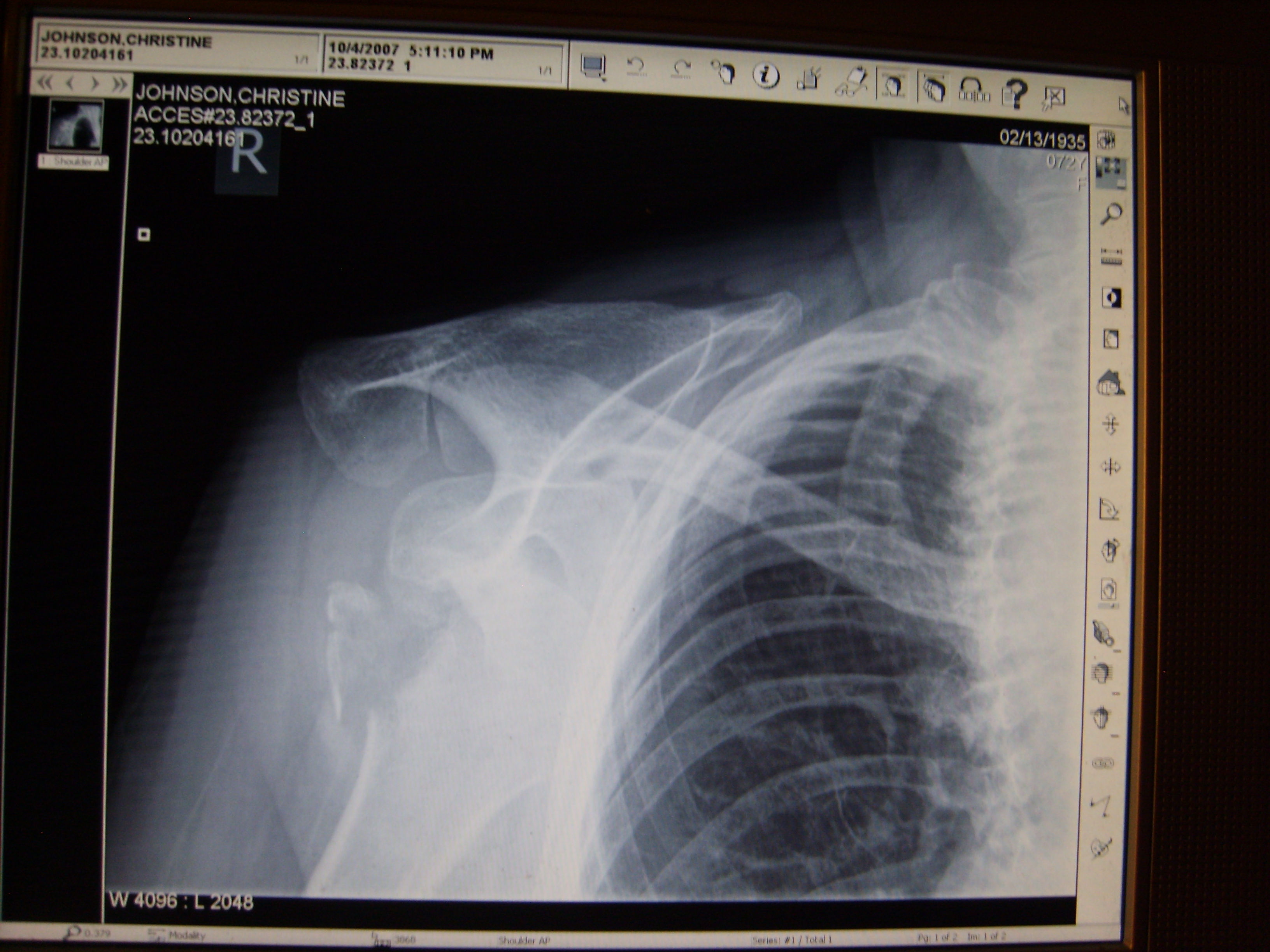 [The x-ray was taken on October 4, 2007, 11 minutes after leaving Dr. Stephen Chow’s office following mother’s ‘exam.’  It is clear, even to a layman, that the shoulder is dislocated and a large piece of bone is broken off and is floating in the area.  While we were unable to view this initially as it required a special viewer for the CD we were given, a report was sent to Dr. Chow by the radiologist shortly after these x-rays were taken.  Dr. Stephen Chow declared in his deposition that he did not see the report but did indicate that he suspected her arm was dislocated at the time he sent her home and rescheduled her appointment for the following week.]